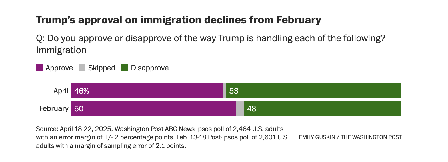 Even on his signature issue of immigration, the latest Post-ABC-Ipsos poll finds that his cruel and unlawful deportation strategy has turned his rating negative, despite the fact a "dwindling number of undocumented immigrants" are now crossing the U.S.-Mexico border.