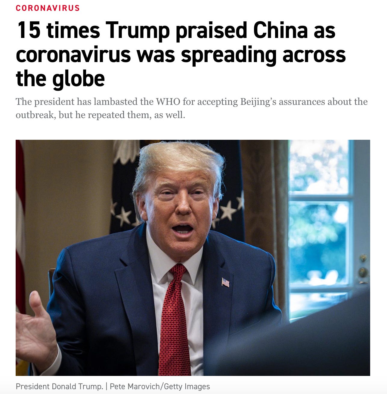 As Politico reported in April, Trump praised China for “its response to the virus throughout January and February” and “touted China’s government for its transparency and hard work to defeat the coronavirus that causes the illness.”