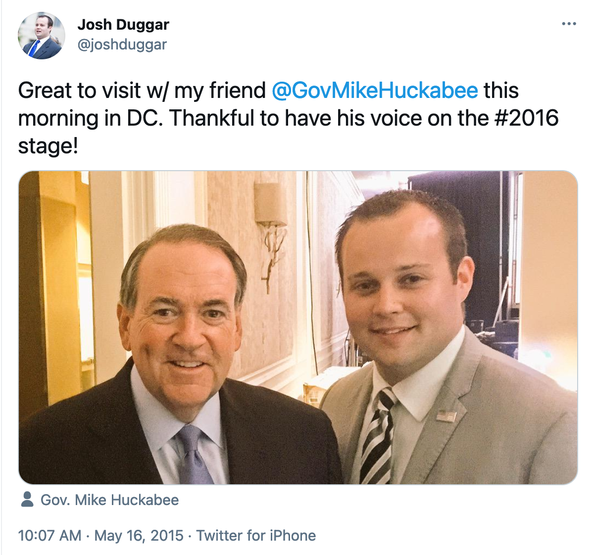 Four months later, when his friend Josh Duggar (one of the "19 Kids and Counting" on the TLC reality show) admitted to molesting five young girls, including two of his own sisters, Huckabee took a gentler tone, saying: "Josh's actions... (were) 'inexcusable,' but that doesn’t mean 'unforgivable.'"