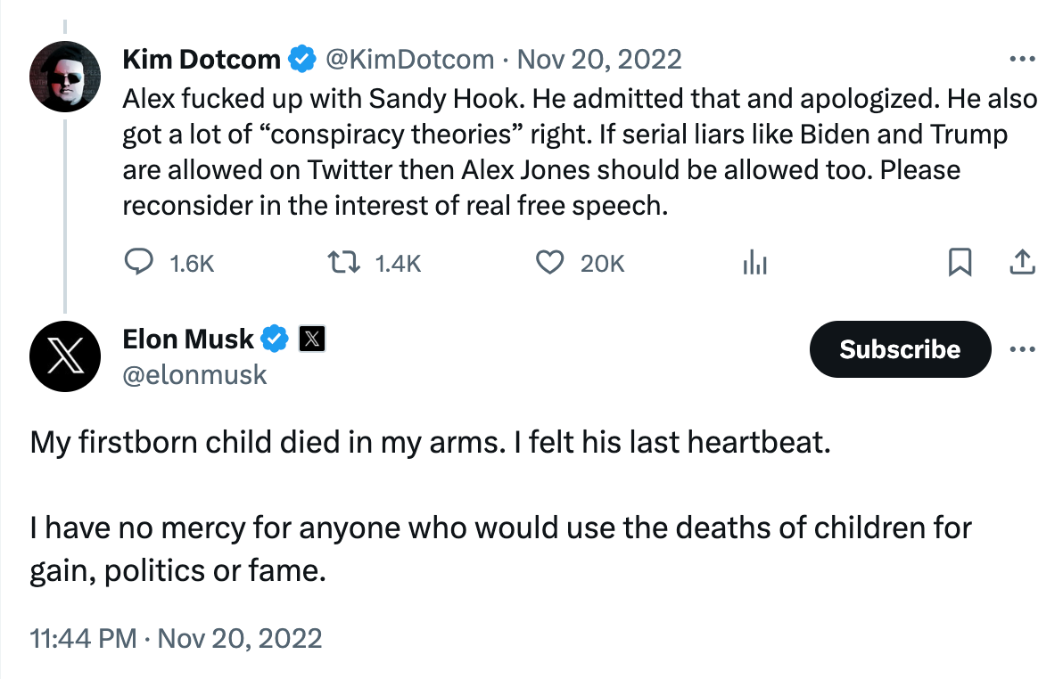 For Musk, not letting Jones back was a intensely personal decision. As he told international fugitive Kim Dotcom at the time: "My firstborn child died in my arms. I felt his last heartbeat. I have no mercy for anyone who would use the deaths of children for gain, politics or fame."