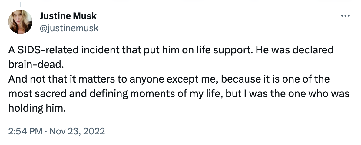 As his first wife Justine Musk pointed out, it was actually she who held their son in her arms as he died.