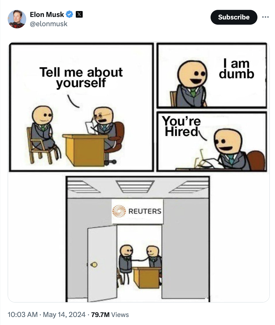 Despite claiming that he wants to restore X's much-(Musk?)-tarnished reputation as a real-time news destination, he is ramping up his attacks on journalism in general and Reuters in particular. (Reuters being the company that has produced dozens of exclusives about Musk and his companies in the past few months, highlighting workplace injuries at SpaceX, safety concerns with his Neuralink brain implants, suppression of customer complaints at his exploding car company, and much more.)