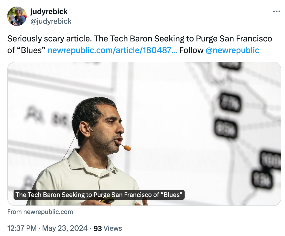 You can hear more about Balaji Srinivasan’s plan to implement “tech Zionism” in San Francisco and the threat posed by Silicon Valley's growing opposition to democracy as host Paris Marx interviews Gil Duran in this recent episode of the Tech Won't Save Us podcast.