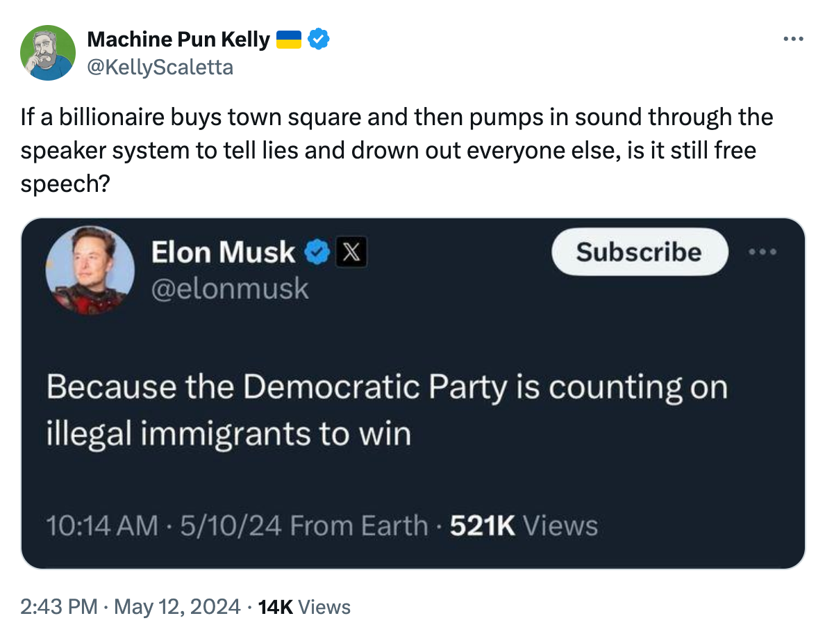 In an example of his broader attacks on "mainstream journalism," Musk amplified a video by comedian @damienslash that generated fewer than 40,000 views in its original post. Musk's post sharing the video has been seen more than 26 million times. Musk routinely brags about the business challenges facing traditional news sites, often celebrating the reduced web traffic they are generating in the X era.