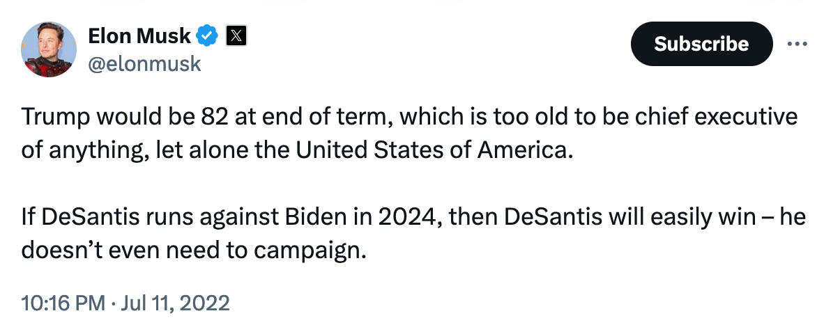 Ron "The Next Great White Dope" DeSantis was famously the fascist originally preferred by Elon "Trump's Too Old" Musk as the 2024 GOP candidate.