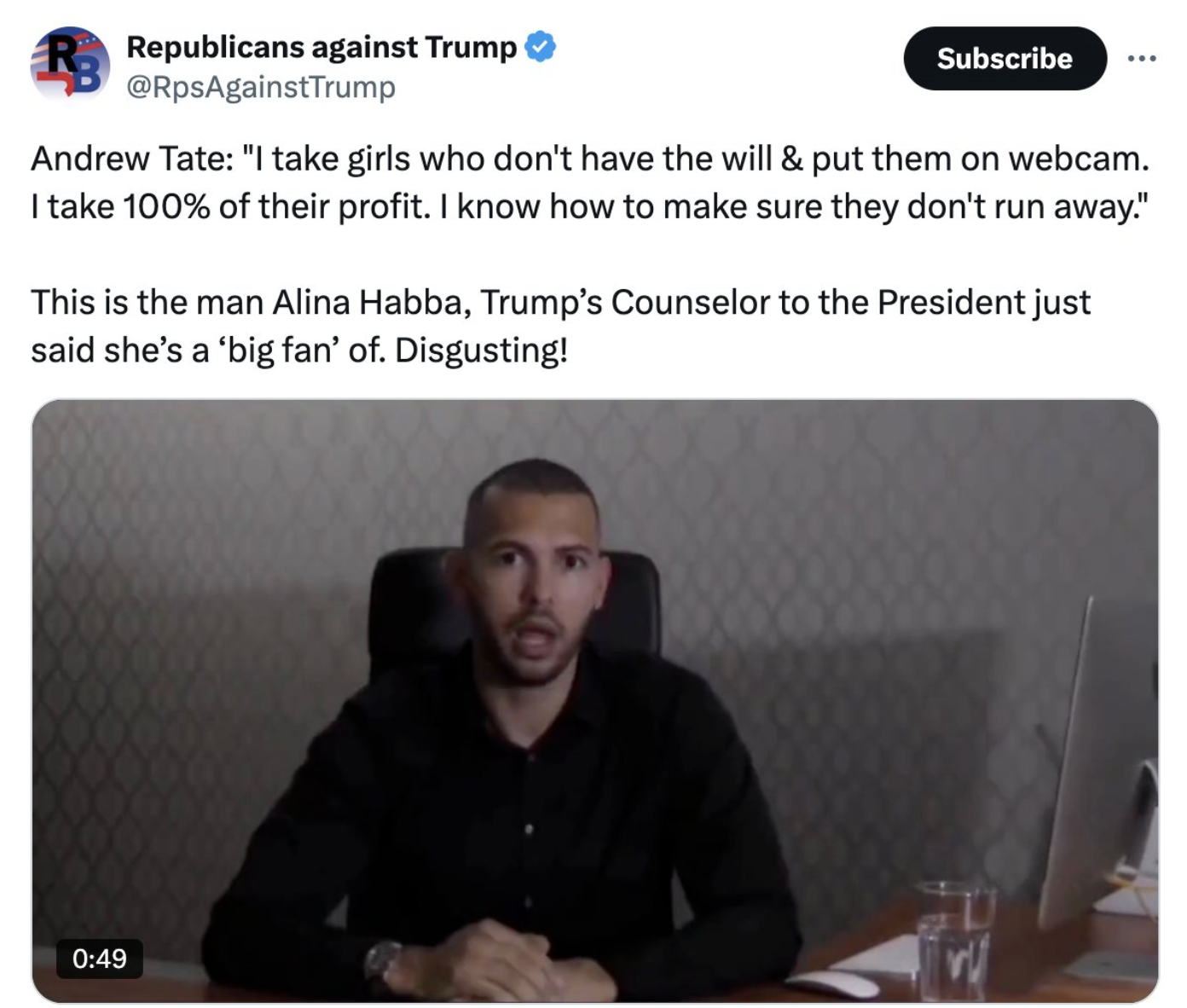 When Habba told Tate this, she knew that Tate and his brother had been accused by Romanian authorities of trafficking women, forcing them to appear in pornographic videos that were posted online, and that the two men face charges of “sexual aggression” in the United Kingdom.