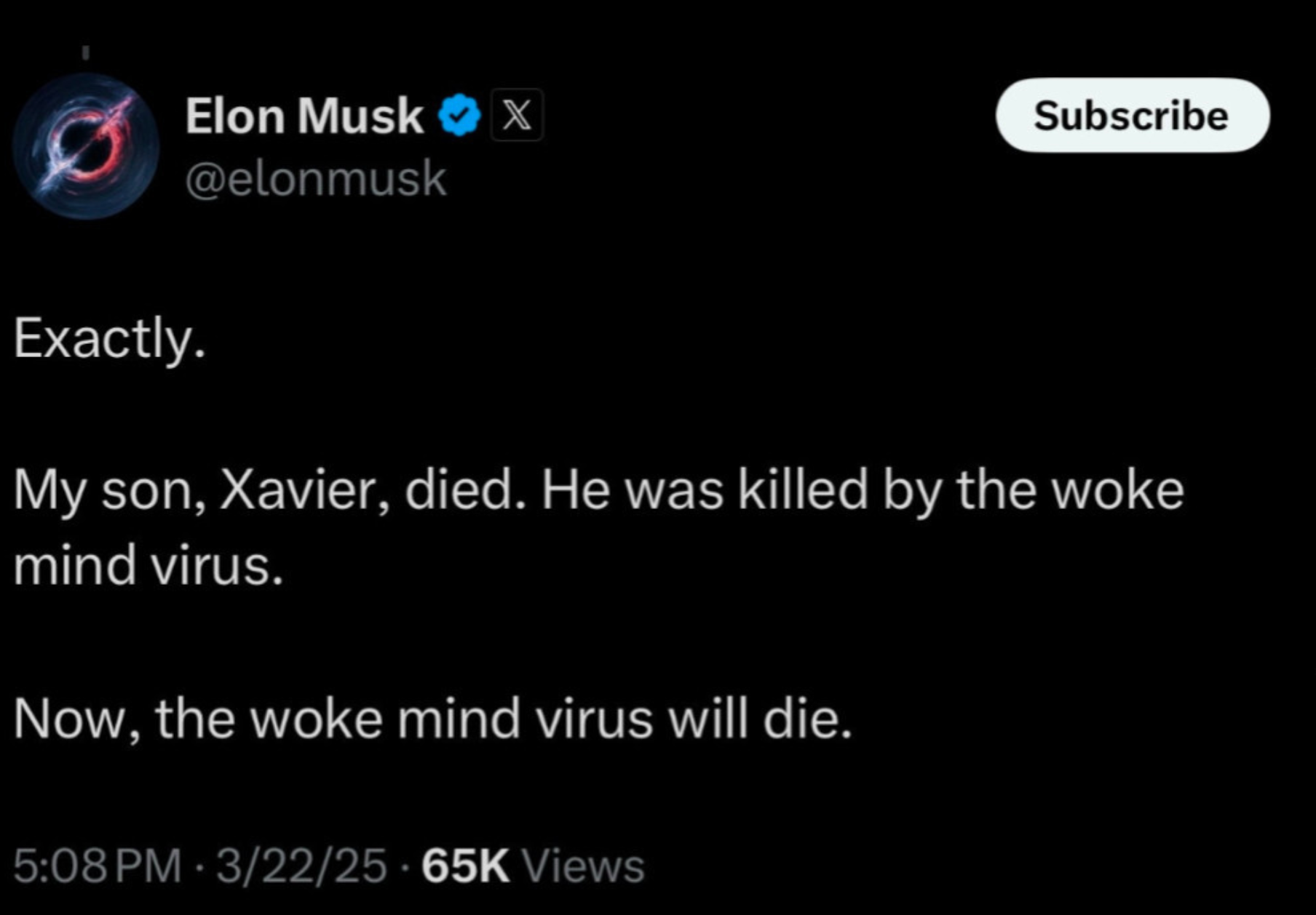 Musk continues to tweet about a dead son that, he claims, "was killed by the woke mind virus."