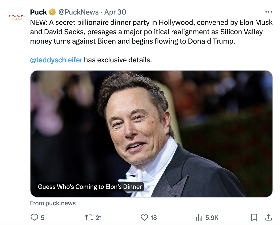Puck News reported this week that Musk and his mini-me sidekick David Sacks recently convened "a secret billionaire dinner party in Hollywood," presaging "a major political realignment as Silicon Valley money turns against Biden and begins flowing to Donald Trump."