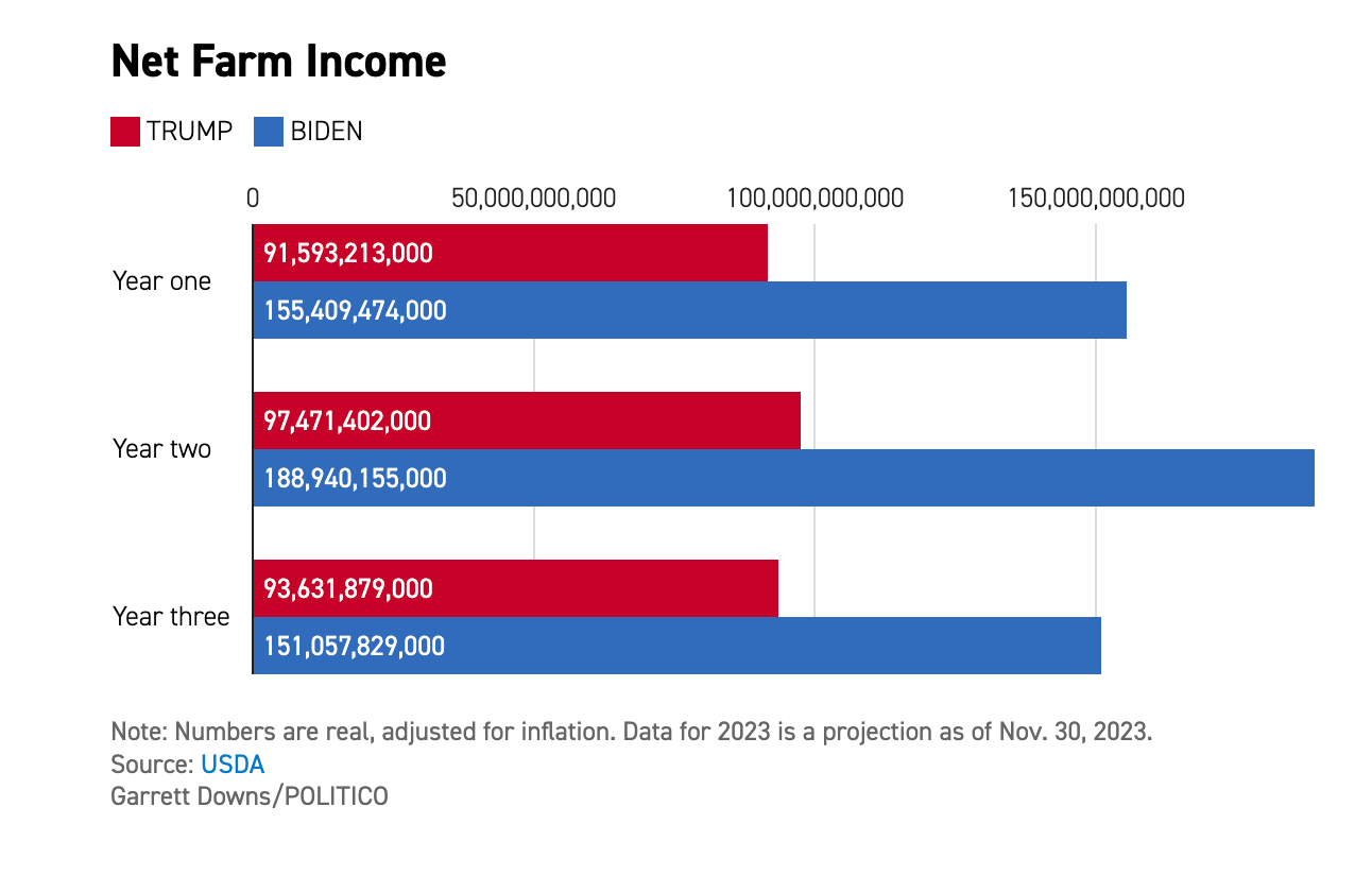 While Trump's first three years were notable for farm bankruptcies and bailouts, Biden has delivered an economic boom for American farmers. U.S. net farm income averaged only $94 billion in Trump's first three years. Under Biden, it is up 75%, averaging $165 billion during his first three years.