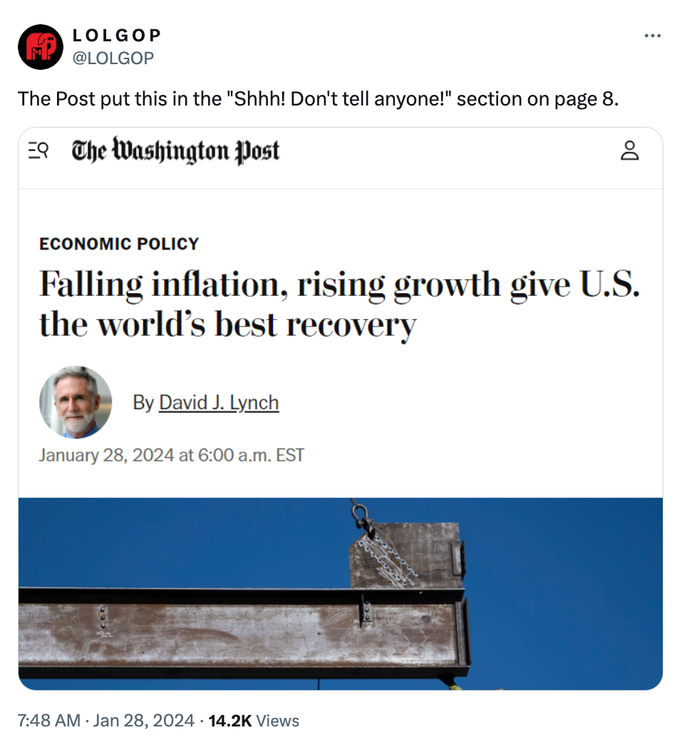 That's how The Washington Post began its January 28 article headlined: "Falling inflation, rising growth give U.S. the world’s best recovery."