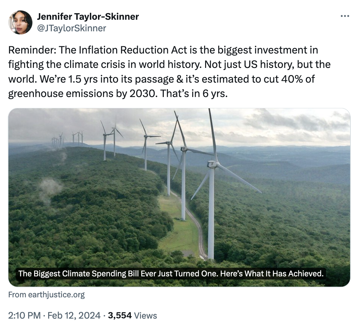 In August 2023, one year after Biden's passage of the Inflation Reduction Act, Earthjustice celebrated these milestones: 170,606 jobs created (and counting). Lower energy costs (dropping by more than $1,000 a year for the average family). New investment in reducing harmful pollution ($27 billion to cut emissions and advance clean energy projects). "If we build on the momentum," Earthjustice wrote, "a future that averts the worse effects of the climate crisis is within reach."