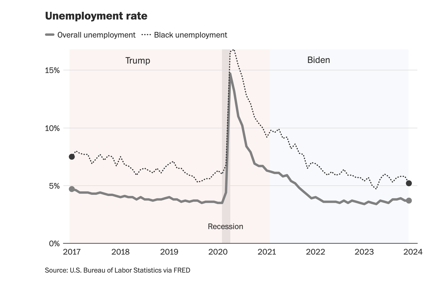Trump still takes credit for reducing Black unemployment to an all-time low. But his failed policies meant Black unemployment was already rising at the end of 2019, before surging when Covid hit. Under Biden, Black unemployment has fallen dramatically, reached a new all-time low in 2023, and remains lower today than its lowest point under Trump.