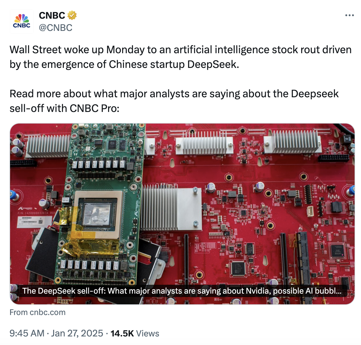 DeepSeek’s accomplishment is... terribly embarrassing, and also threatening for big tech and the American security apparatus. The presumption was that raw computing power is a competitive barrier in AI, these new models suggest it may not be as much as we thought. Meanwhile, short-sellers are salivating.