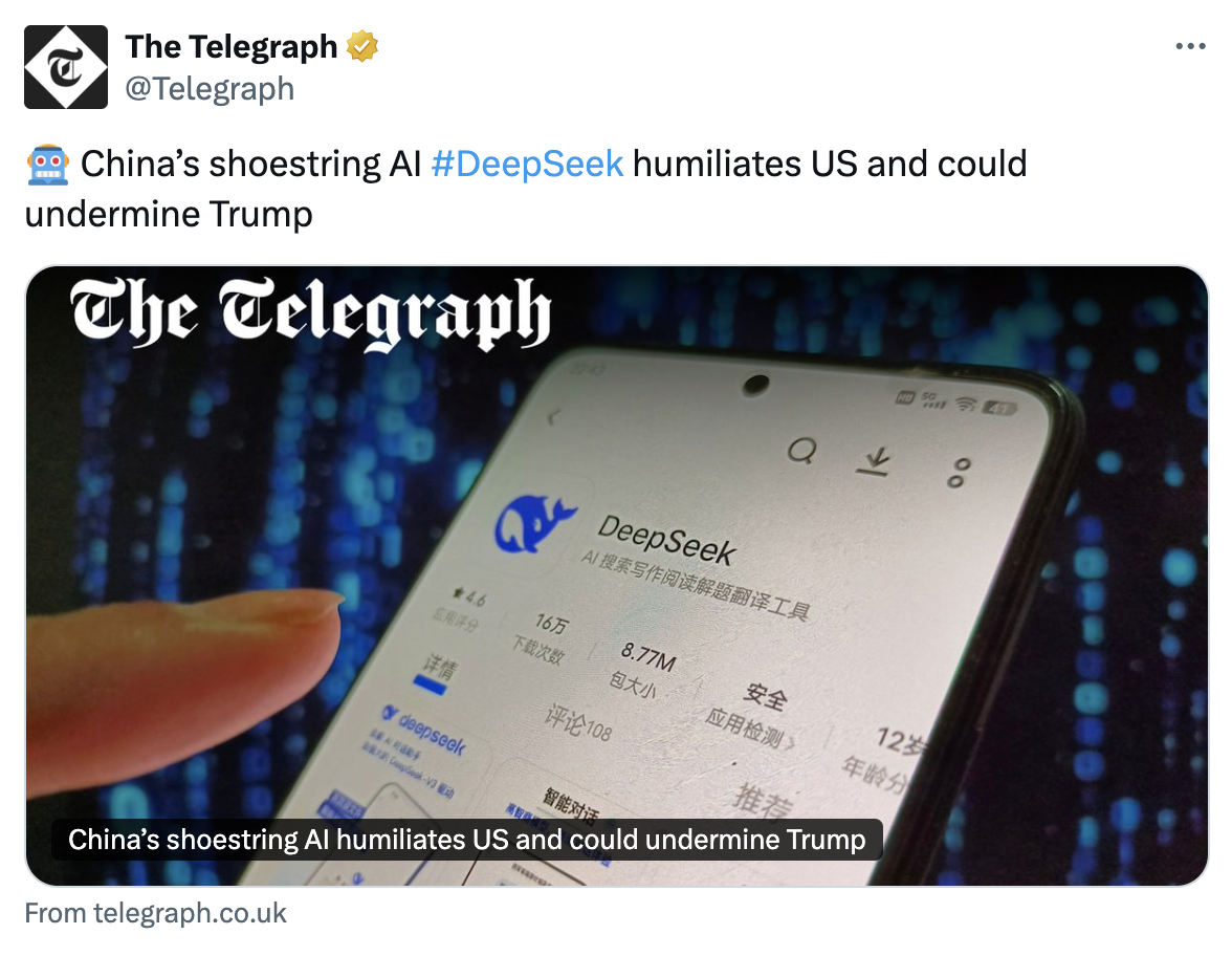 As the UK's conservative Daily Telegraph put it, the success of DeepSeek is humiliating the US and "could undermine Trump."