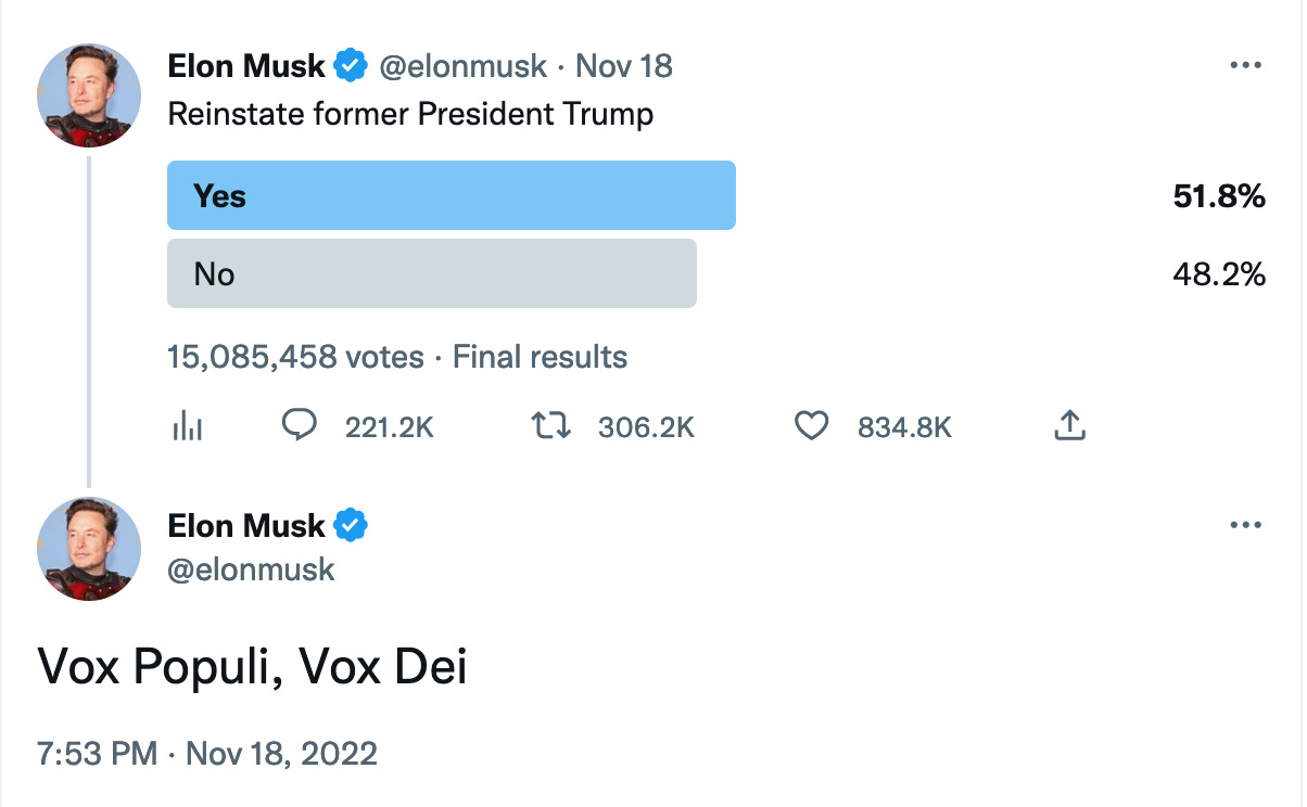 At first, Musk’s Twitter polls seemed to deliver the results he and his alt-right fanboys wanted. When more than 15 million “people” voted in his poll and narrowly approved the Twitter reinstatement of Donald Trump, Musk tweeted: “The people have spoken. Trump will be reinstated. Vox Populi, Vox Dei.”