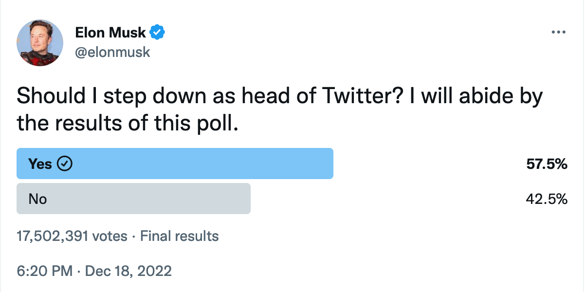 Things changed, however, after more than 17 million votes were cast in Musk’s biggest Twitter poll to date and users demanded—by a 15-point margin—that Musk step down as head of Twitter: