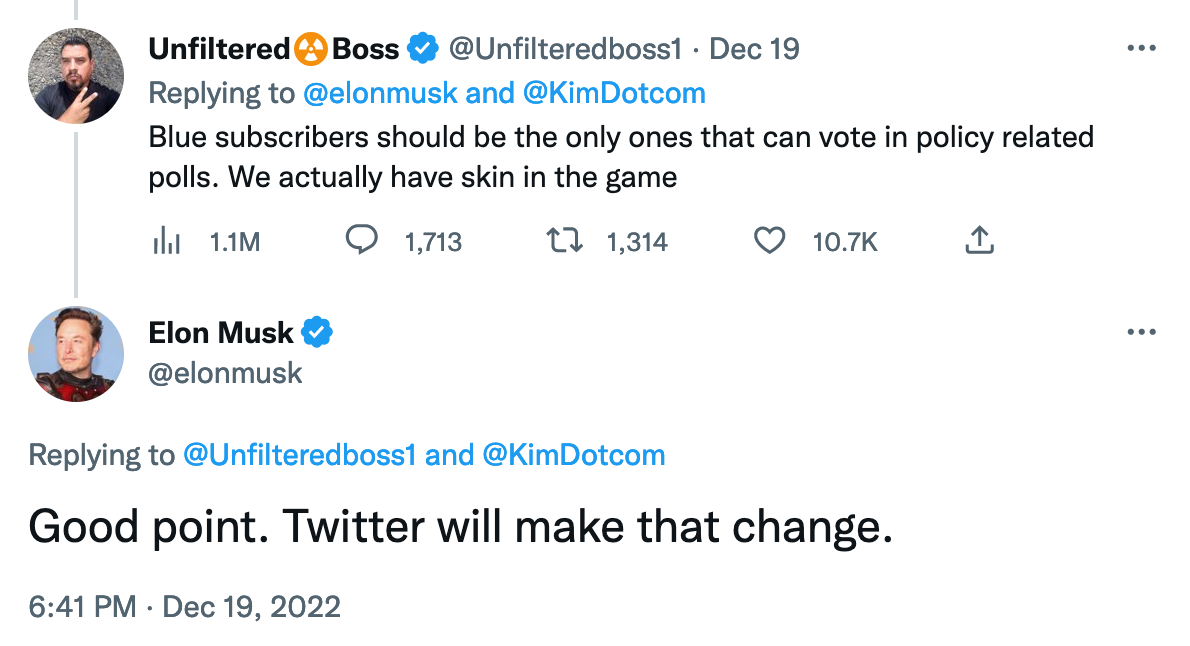 Meanwhile, Musk immediately latched onto the suggestion that future policy-related polls be limited only to those paying him $8 a month (or $11 through the App Store) to be “Twitter Blue” subscribers.