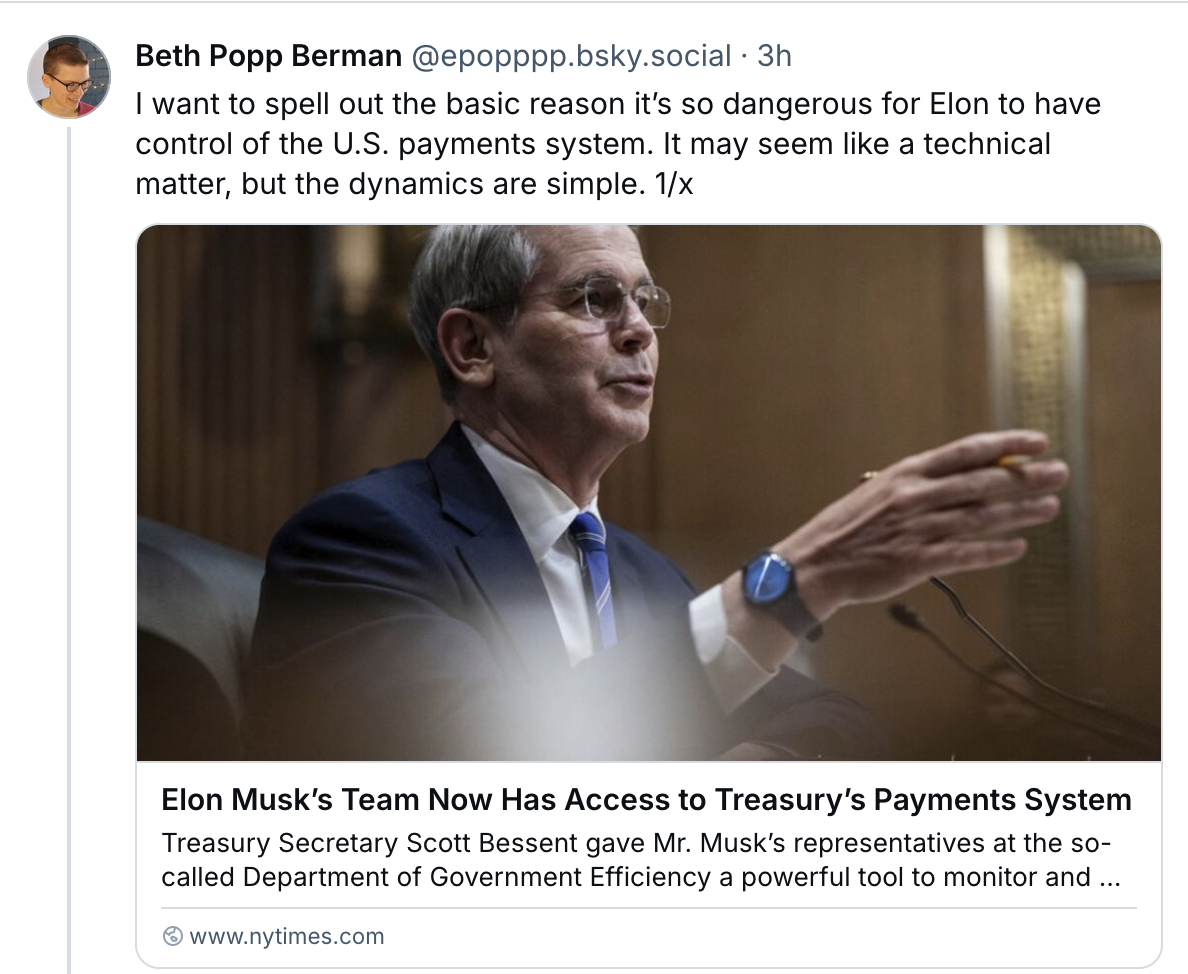 Trump's new Treasury Secretary Scott Bessent just gave Elon access to the government's payment system, meaning he can now "unilaterally restrict disbursement of money approved for specific purposes by Congress, a push that has faced legal roadblocks."