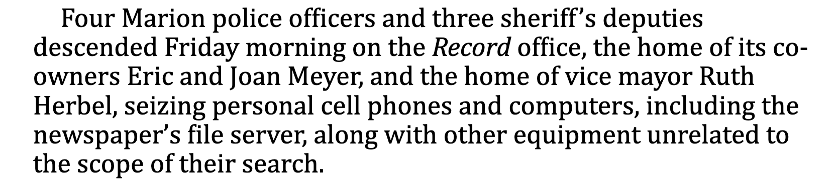 According to the newspaper, a two-page warrant signed by Magistrate Laura Viar was presented at the paper's offices and at the Meyer and Herbel homes.