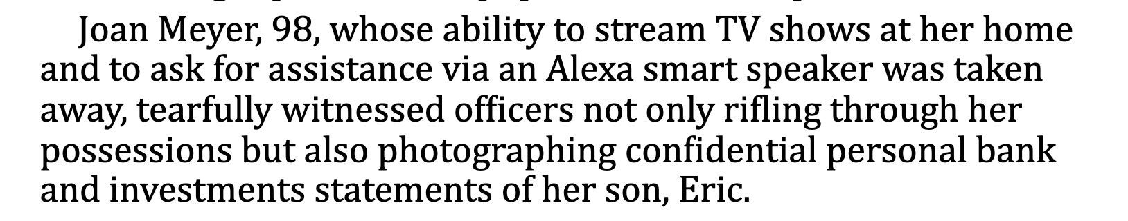 Update: 98-year-old Joan Meyer collapsed and died the day after the raid.