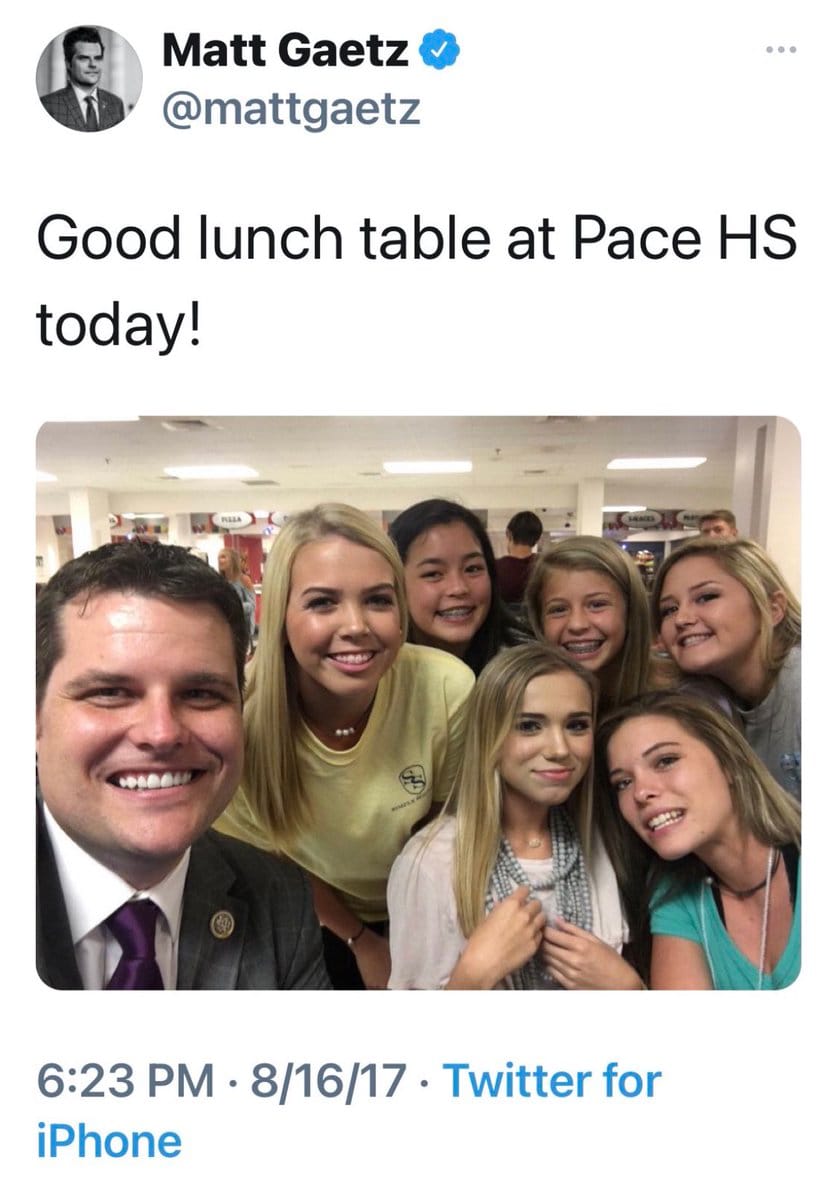 Between May and November 2017, Gaetz wasn’t just cruising high schools to take selfies with children. According to published reports, during those months he and his now-convicted BFF Joel Greenberg were, among other things, having sex with a minor.