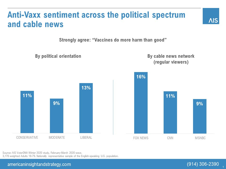 So, in the case of views on vaccines, if you look at the political distribution of anti-vaxxers, there’d be no reason to believe they’d be concentrated in Fox News’ audience. But they are. There are more anti-vaxxers in the Fox News audience, proportionately, than CNN or MSNBC. Hannity viewers have the highest anti-vax profile among the nine primetime shows on the three cable news networks. They’re almost twice as likely as the average American to have strong anti-vaccine feelings (19% vs 11%).