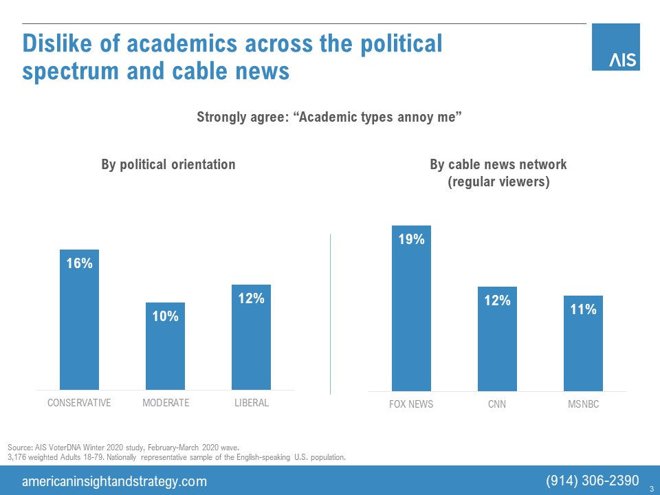 But Fox News viewers more often choose the president. They want to be led, not to think of themselves as the leader. What does that have to do with science? It happens that the same conservative sub-segment is skeptical of academic types, and their own educational attainment is not as high.