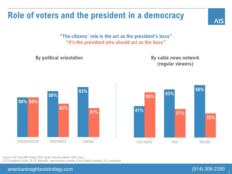 In each survey we ask Americans a fundamental question about democracy. We ask them to choose between two options: “The citizens’ role is to act as the president’s boss” and “It’s the president who should act as the boss.” Most Americans, including half of conservatives, choose the people. As Lincoln said, this is a nation of the people, by the people, for the people.