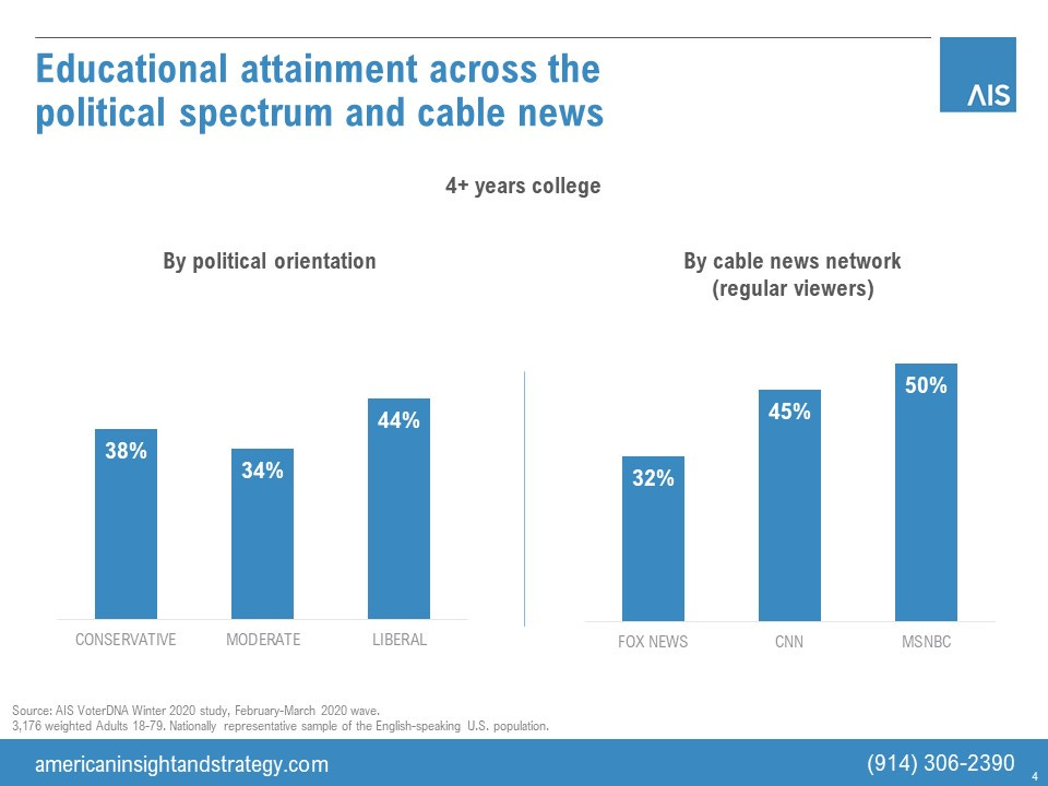 Most of the major news organizations’ audiences have an above-average college graduate profile. For Fox News it’s below the national average. So Fox News’ business model is to consolidate and own a conservative sub-segment that is less educated, more skeptical of science, and has a followers’ mentality. Donald Trump owns this sub-segment as well, in politics.