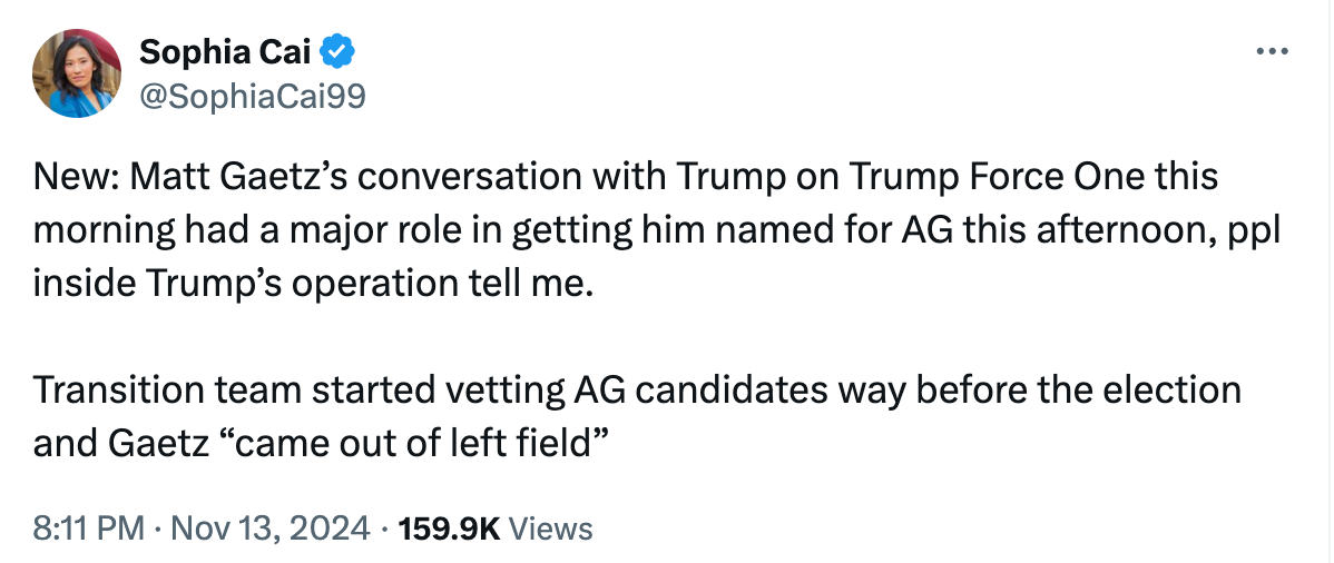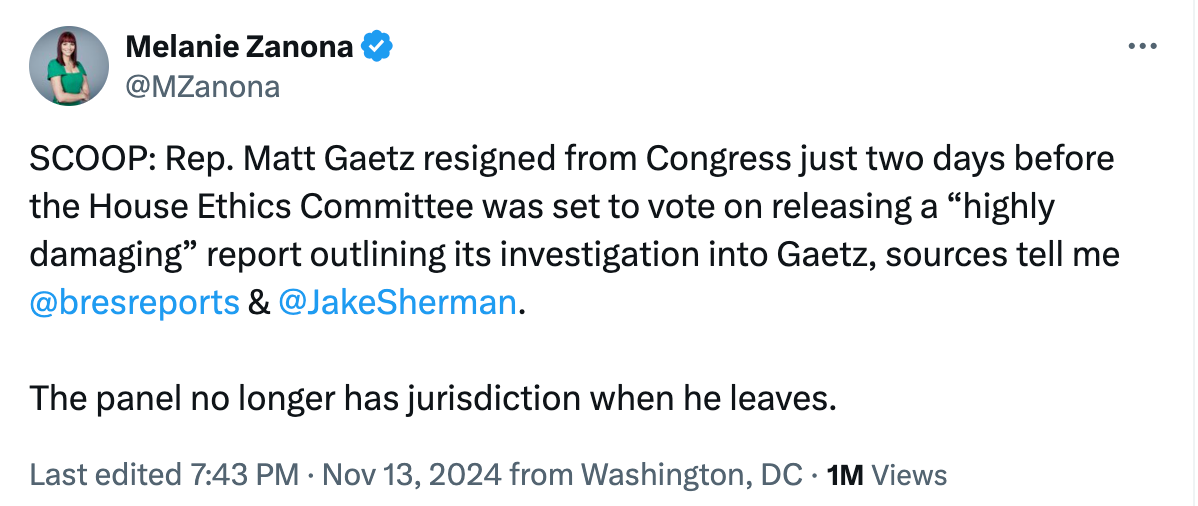 The most obvious answer is Trump is simply giving Gaetz the cover to resign in order to quash the Ethics Committee's investigation, preventing the damning report from ever seeing the light of day. (As long as Trump remembers to turn the screws on MAGA Mike Johnson to make sure the Ethics Committee doesn't decide to go rogue and release it anyway.)