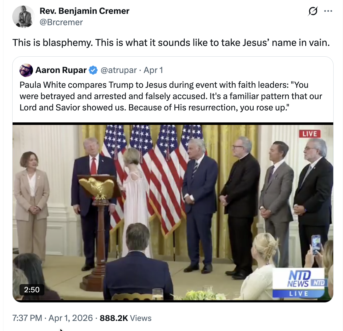 At an April Fool's Day event at the White House this week, "prosperity gospel" TV evangelist Paula White compared Donald Trump, a man who has spent a lifetime preying on the weak and vulnerable both sexually and financially, to Jesus Christ himself.