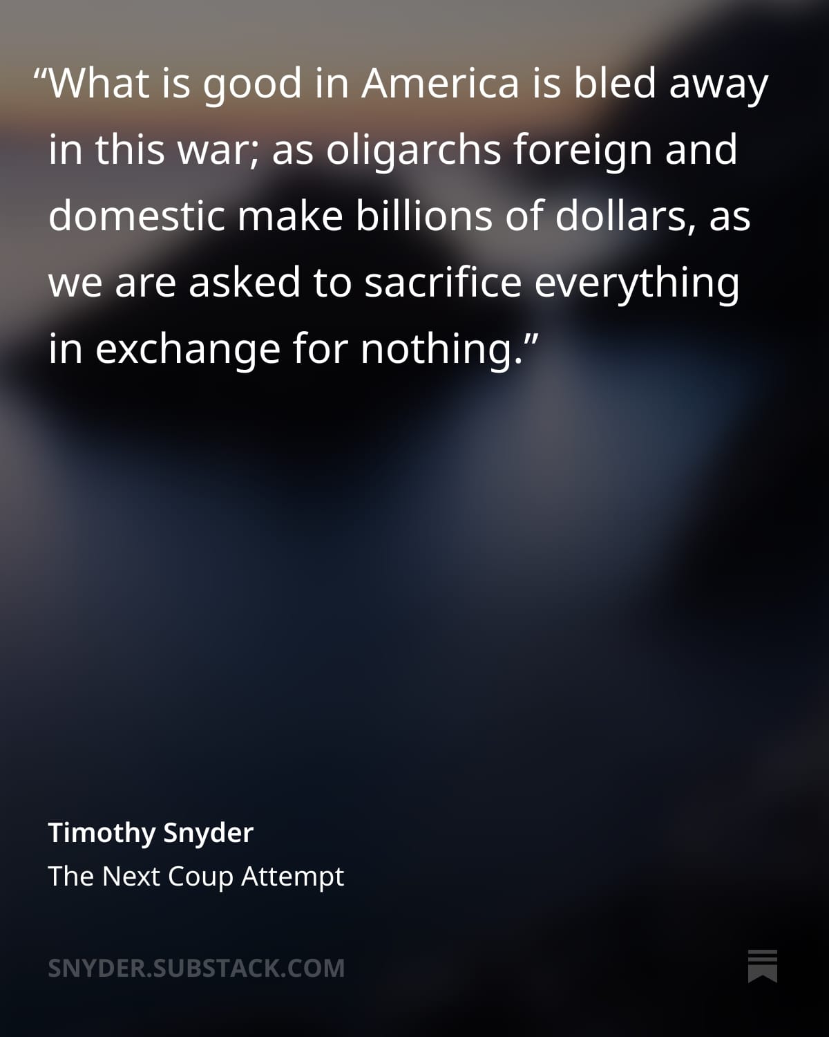 As Timothy Snyder explained on Substack on April 4, the debt-busting war in Iran sets the stage for "The Next Coup Attempt" by Trump and his anti-christian, anti-democracy allies.
