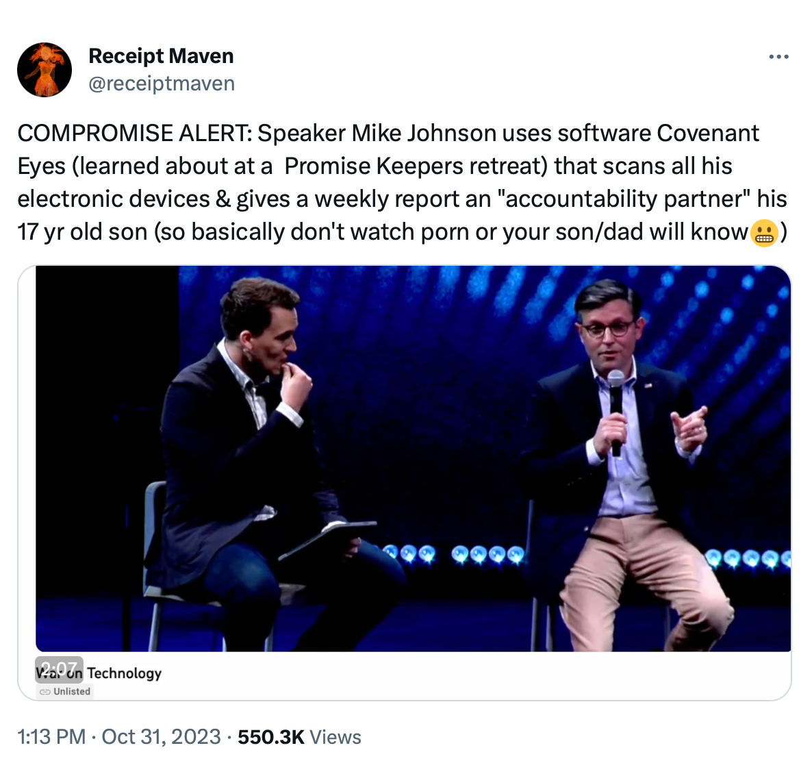 House Speaker Mike Johnson allows an outside Christian based surveillance company “Covenant Eyes” to access his electronic devices and prepare a weekly report to make sure he is not viewing any “objectionable” material. This opens up the Speaker to a real security risk. To allow a non secure outside source full access to the Speaker of the House’s phones and computers is a security breach waiting to happen... as Speaker of the House, Johnson needs to have secure and private conversations that are not shared with others. According to Johnson a weekly report of all searches etc is viewed and prepared. A clear National Security risk for the Speaker of the House. The Republicans did not think this through before making MAGA Mike Speaker.