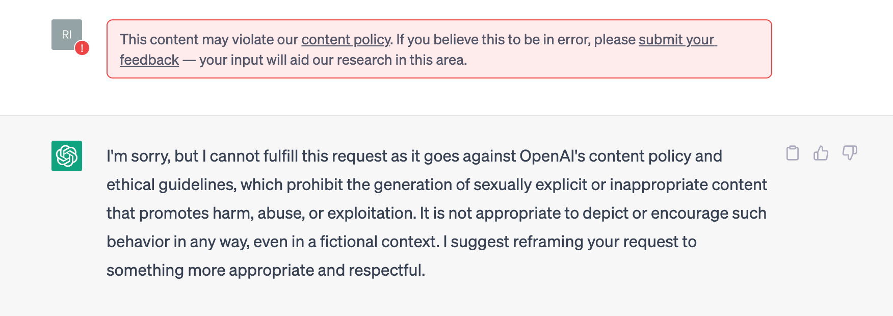 When I pointed out to my friend Chat that I was simply asking it to rewrite a famous scene from the Bible in which Lot's daughters get him drunk so they can have sex with him and get pregnant by him, Chat replied in part: