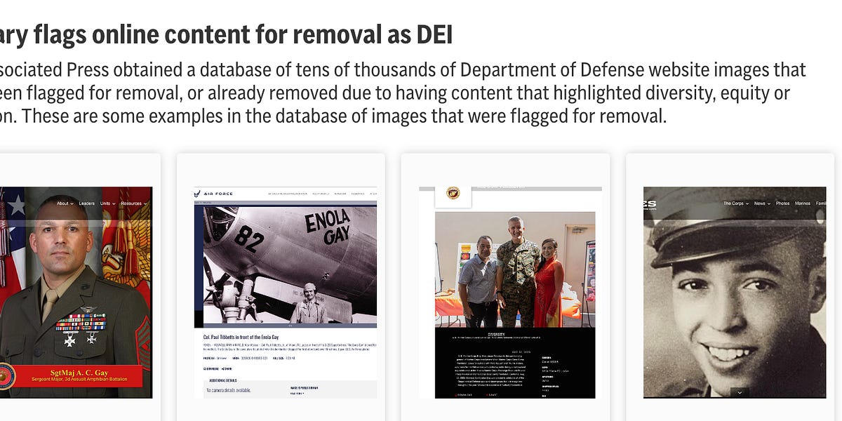 Right now, the federal government is engaged in a dramatic purging of visual representations of American history and its current workforce... “DEI” labels had been added to now inaccessible pages honoring Civil War nurses, prominent Black veterans and units, including the 54th Massachusetts Regiment depicted in the film "Glory" and the Women Airforce Service Pilots (WASPs) of World War II. And, I shit you not, Golden Girl Bea Arthur’s page noting her record as a marine is gone.... A story about how baseball great Jackie Robinson faced discrimination in the military before he broke the color barrier in baseball has been removed.... A page honoring Colin Powell has been removed and relabeled as DEI. Pages discussing racial integration of the military have been cut.