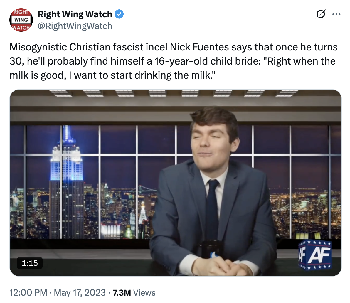 The idea of older men marrying and impregnating girls as young as 16 has also been promoted by the likes of far-right extremists including Nick Fuentes and Matt Walsh.