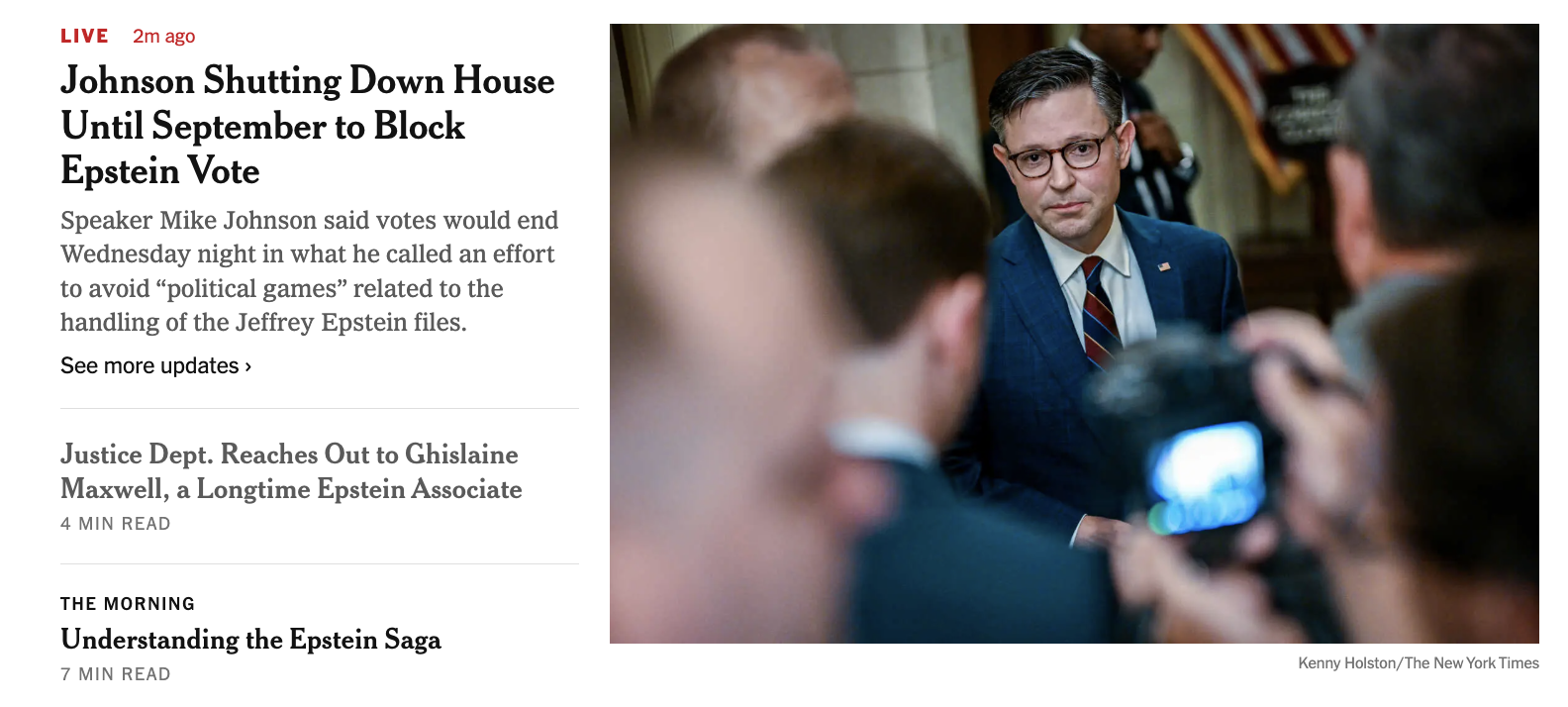 Also Tuesday, Speaker Mike Johnson, a Russian-financed Republican (who may or may not be subject to blackmail based on his own history of "adopting" a Black boy while a 20-something anti-gay singleton in Louisiana) who just four days ago called for "maximum transparency" on Epstein, announced that Republicans hoping to vote to RELEASE THE EPSTEIN FILES would have to cool their jets until at least September.