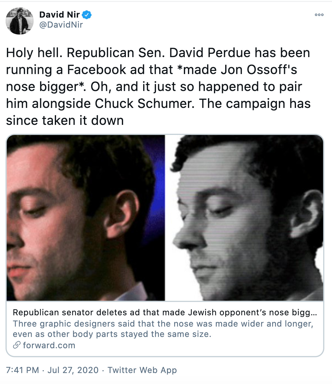 … In July, after Perdue denied his campaign was engaging in anti-Semitic propaganda by enlarging his Jewish opponent’s nose in a campaign ad, Ossoff tweeted that “literally no one believes” Perdue’s explanation.