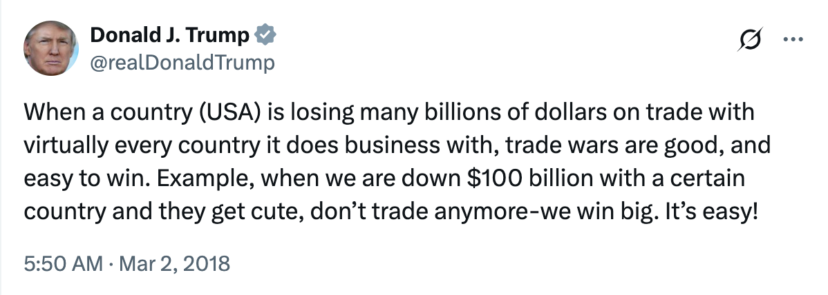 In 2018, two months after Trump began claiming that "trade wars are good, and easy to win," the National Retail Federation hired Ben Stein to reprise his Ferris Bueller role with the seemingly idiot-proof message that "trade wars don't work, they never work."