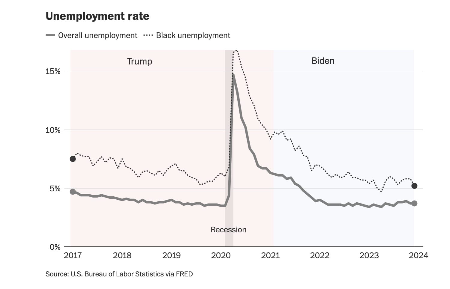Fact check 1: Trump's failed policies meant Black unemployment was already rising at the end of 2019, before surging when Covid hit. Biden reduced Black unemployment to an all-time low in 2023, below 5% for the first time in history.