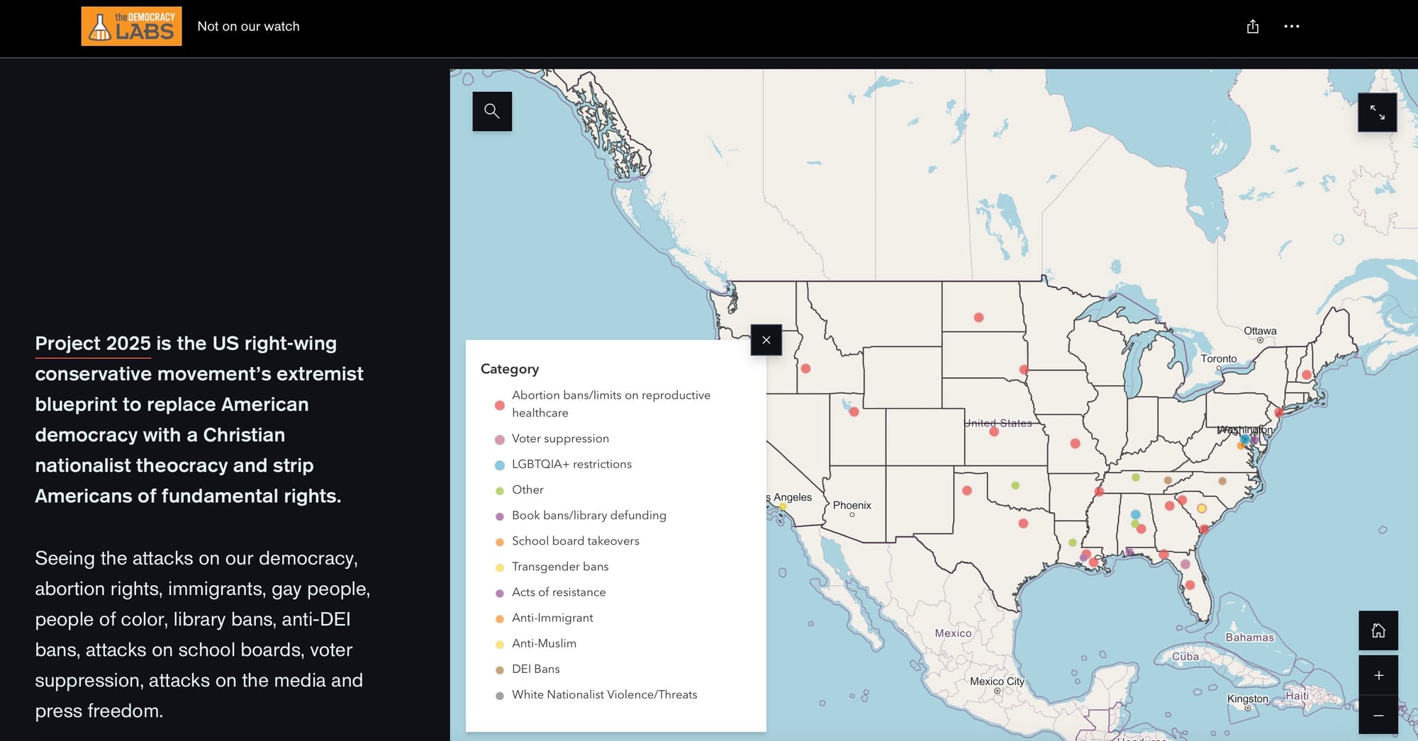 Report a Project 2025 incident in your area at the "Not on Our Watch" Survey, a collaboration between Andra Watkins, The Democracy Labs, and Stop the Coup 2025.