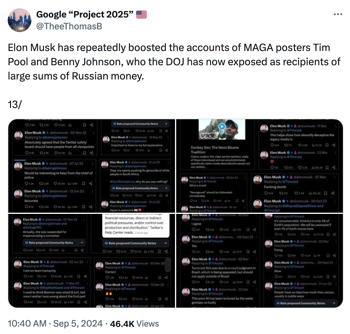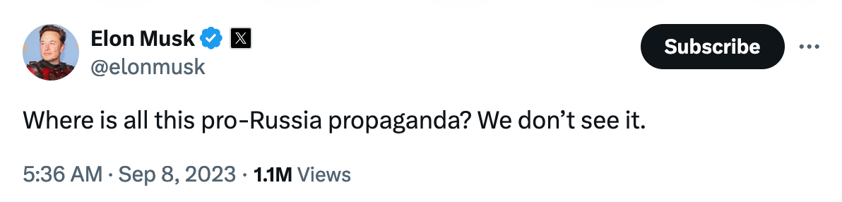 Musk, of course, "repeatedly boosted the accounts" of the right-wing grifters getting paid hundreds of thousands of dollars per month—by Russia—to interfere in our election. And those grifters were, of course, double-dipping as "Blue-Check" influencers and also getting paid by X for the divisive content Elon was amplifying.