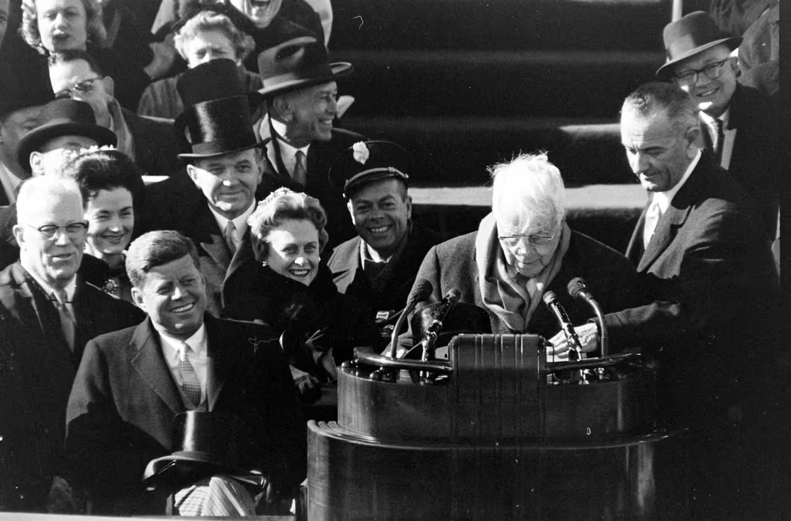 1961: 86-year-old Robert Frost recites a poem from memory at JFK's inauguration... in 22 degree weather.
