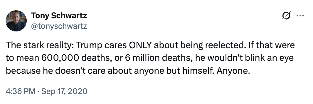 As Trump's Art of the Deal ghostwriter Tony Schwartz tweeted at the time, Trump cared "ONLY about being reelected."