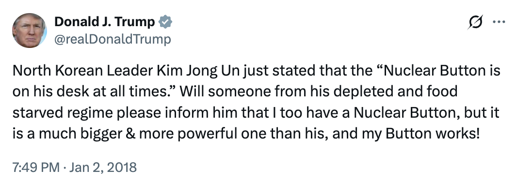 Trump's first campaign and first presidency were peppered with alarming references to nuclear war, including a threat to "totally destroy North Korea," and frightening Twitter outbursts, including bragging about how much "bigger & more powerful" his nuclear button was than Kim Jong Un's.