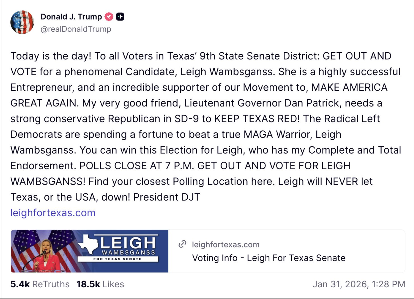 "Today is the day!" wrote President Donald J. Trump on Truth Social on Saturday January 31 in a post urging all voters in Texas' 9th State Senate District to get out and vote for "a phenomenal candidate, Leigh Wambsganss."