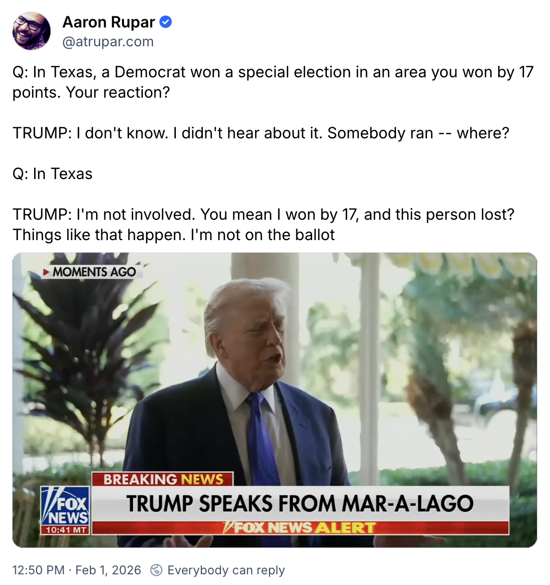 During a February 1 interview with Fox News, video of which was posted on Bluesky by Aaron Rupar, Trump claimed he hadn't heard about the previous day's election, including who might have been running or where it was taking place.