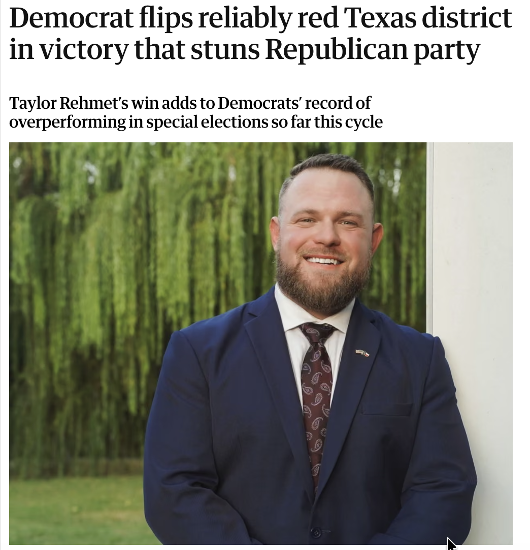 Taylor Rehmet's "victory added to Democrats’ record of overperforming in special elections so far this cycle. Democrats said it was further evidence that voters under the second Trump administration are motivated to reject GOP candidates and their policies."