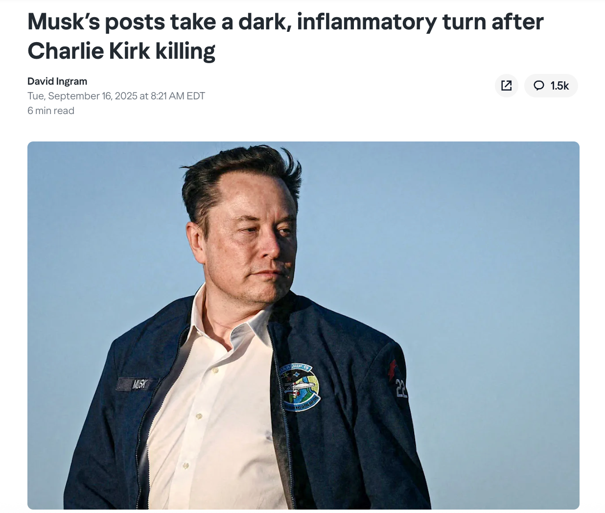 In the days following the murder of Charlie Kirk on September 10, Elon ratcheted up his calls for violence with "dark, inflammatory" tweets on X and an incendiary speech to 100,000-strong crowd of white supremacists in the UK that was denounced by Downing Street as "dangerous and inflammatory."