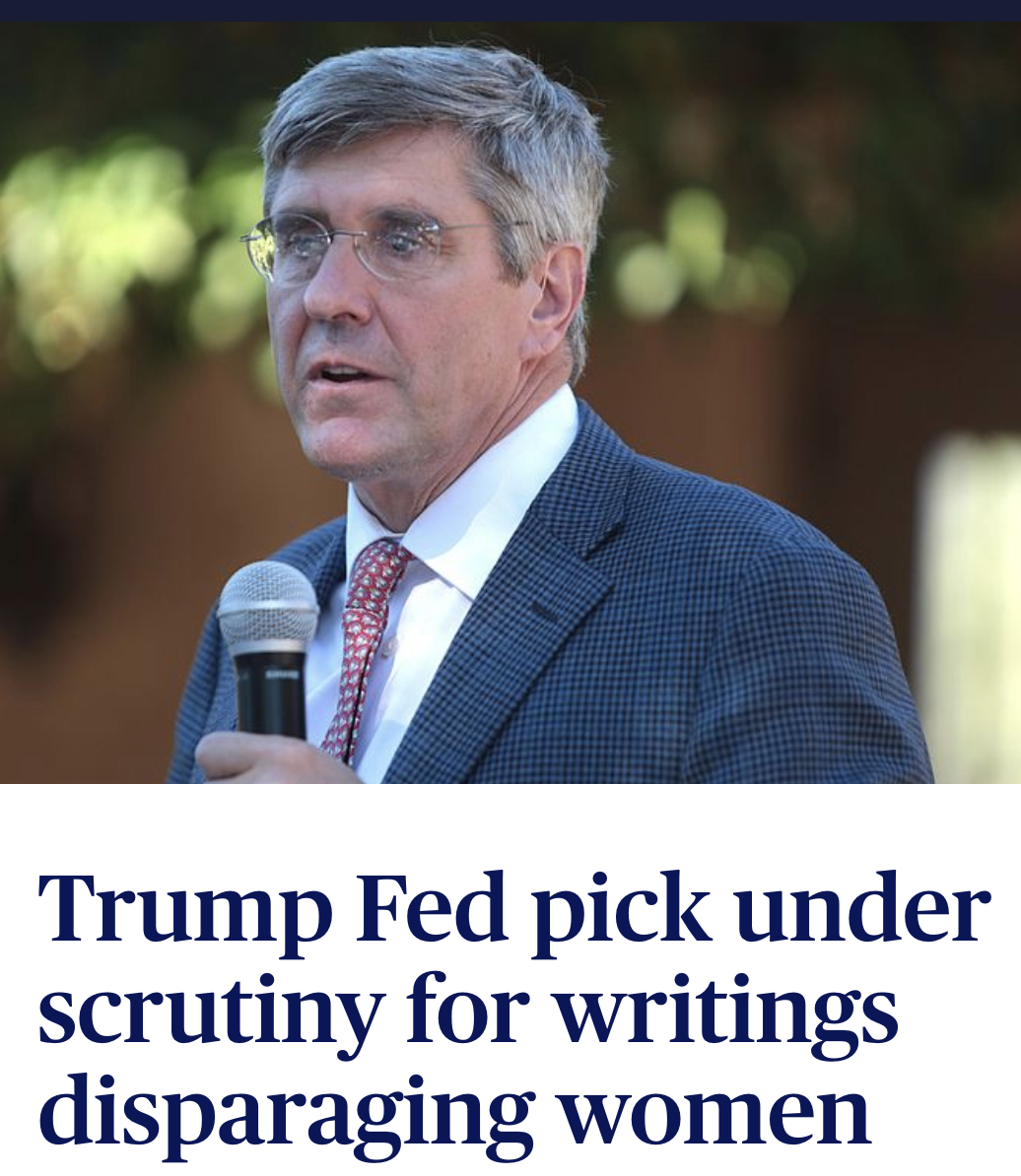One remark that has gone largely unnoticed is Trump's comments about the (Fed-hating) economist Stephen Moore, a kook Trump tried to nominate to the Federal Reserve board in 2019. Moore was forced to withdraw from that opportunity because of his absolutely bonkers theories about why women should be forever compelled to earn less than men.
